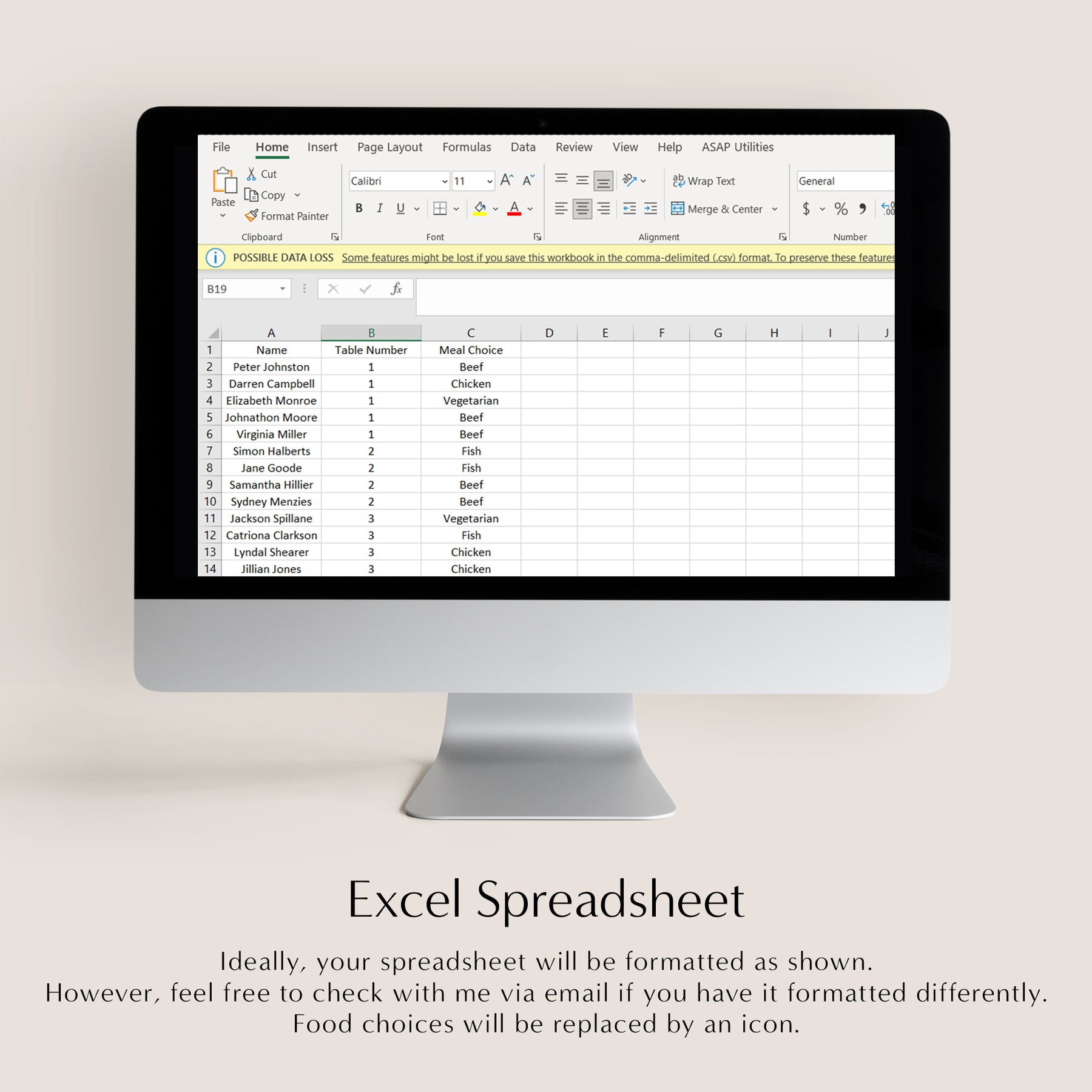 Excel Template for Place Card name, table numbers and food choices