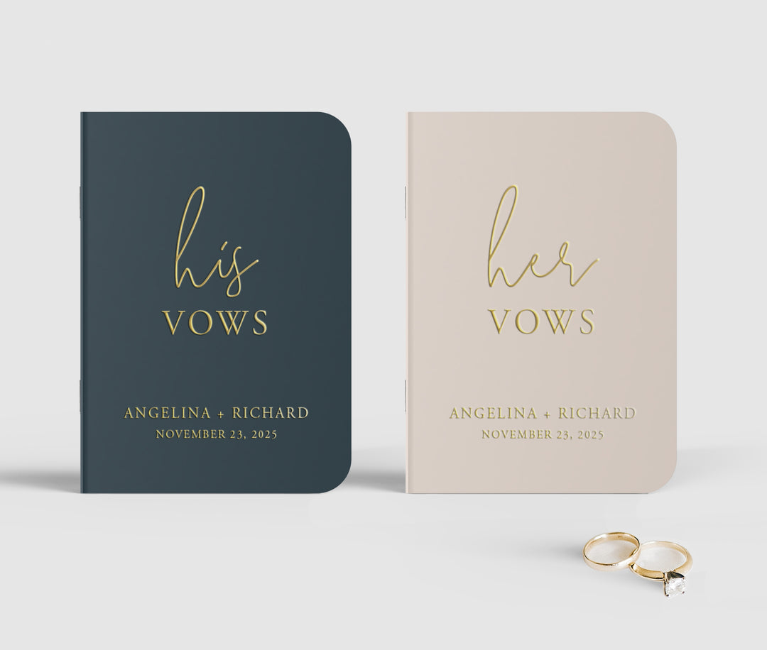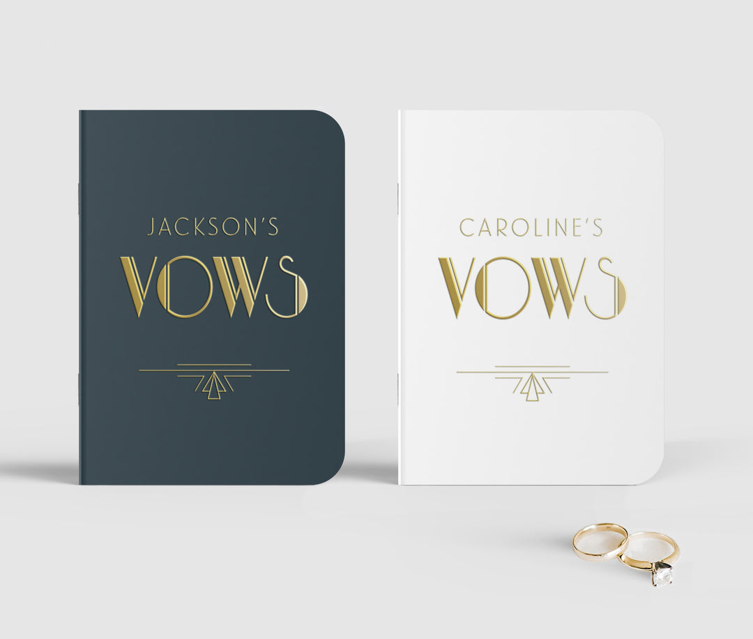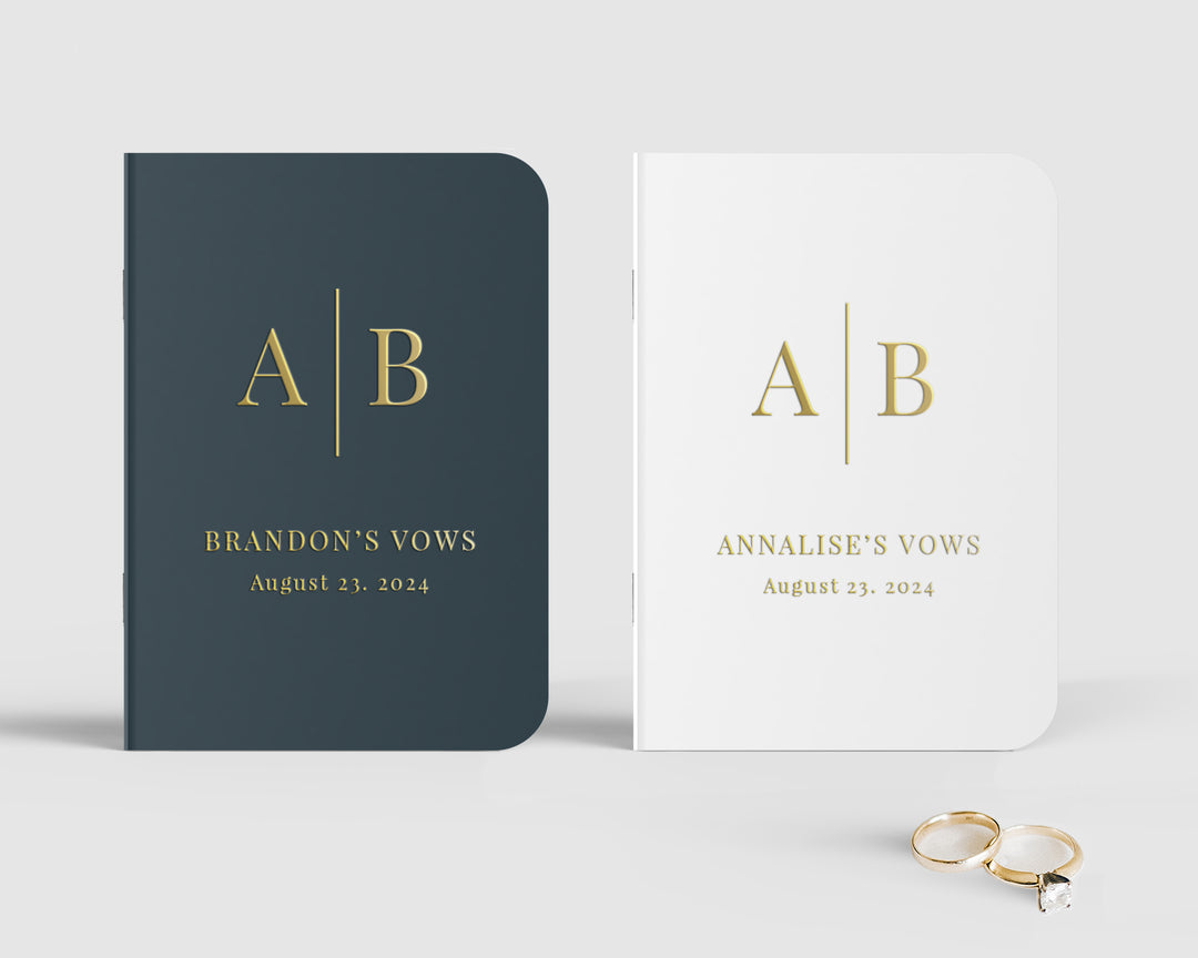 Wedding Vow Books (set of 2) are a special keepsake that will be cherished for years to come. Each book holds 24 sheets of white lined paper that is acid-free so it won’t turn yellow or deteriorate over time. Our Vow Books are embossed with Gold, Silver, or Rose Gold Foil and include personalizations on the front cover, as well as your own special words on the back.