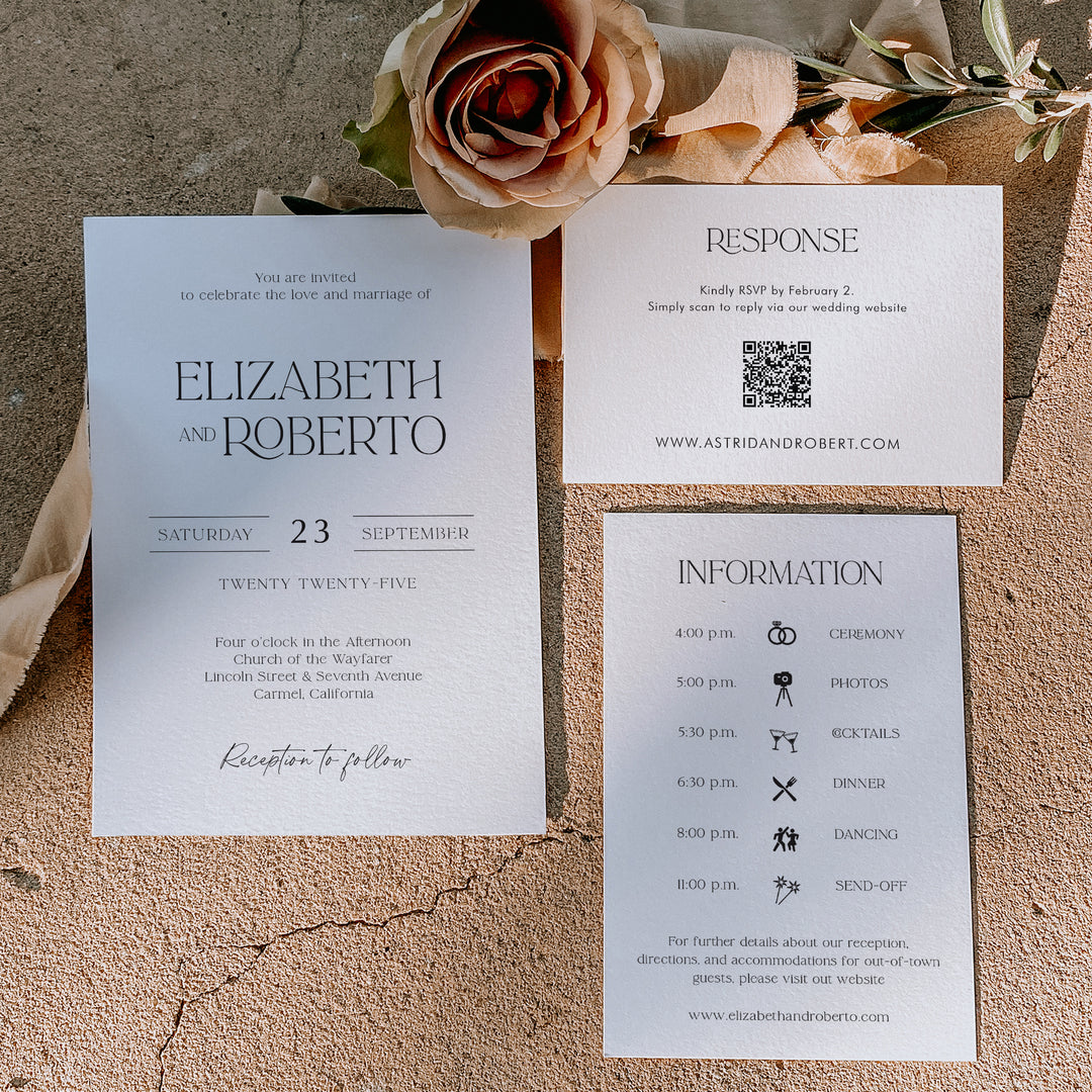 Our Wedding Invitation Suites offer flexibility and great looks! Order an invitation alone, or add insert cards and envelopes as needed. We ae always happy to customize as required - you may prefer an RSVP card that can be mailed, rather than with a QR Code for online response. We are here to create a cohesive, practical, and beautiful outcome for you!